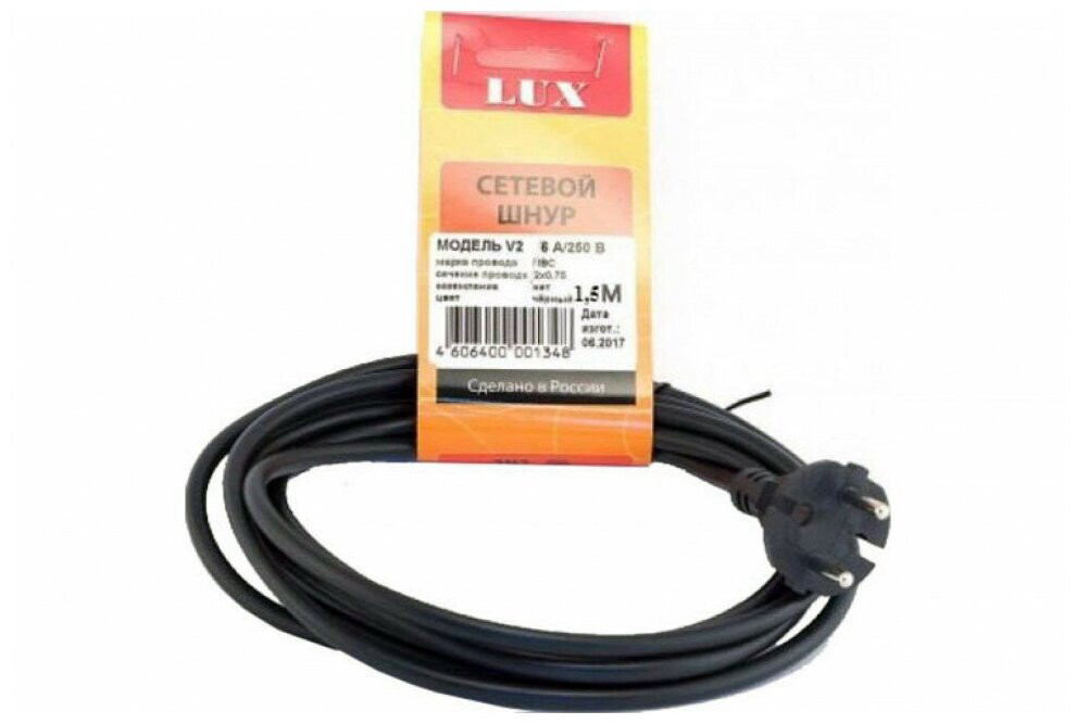 Сетевой шнур LUX V2 ПВС 2*0,75 1,5м с вилкой без з/к черный