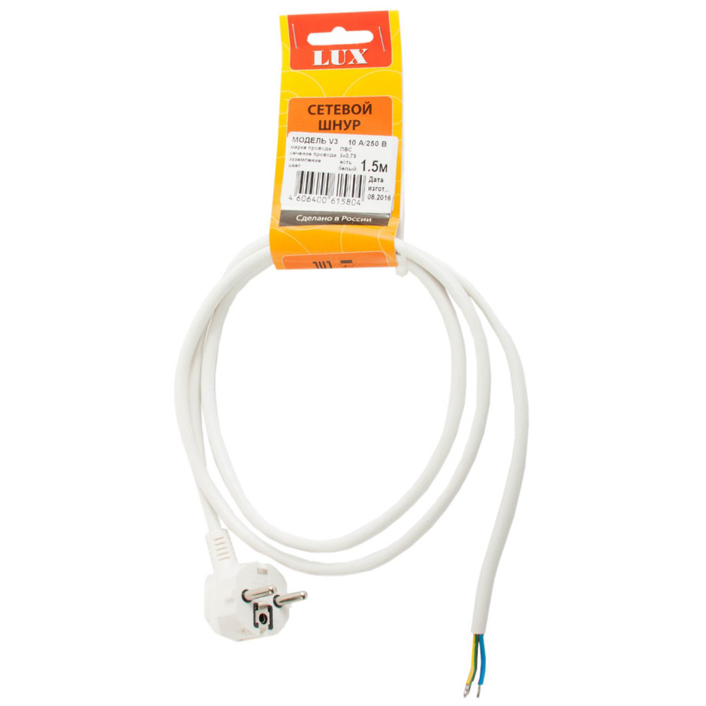 Сетевой шнур LUX V3 ПВС 3*1,5 1м с вилкой с з/к белый
