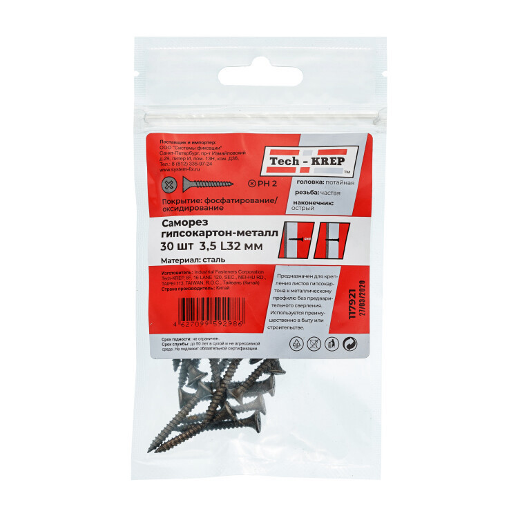 Саморезы гипрок-металл 3,5*32 (30шт)-пакет Tech-Krep