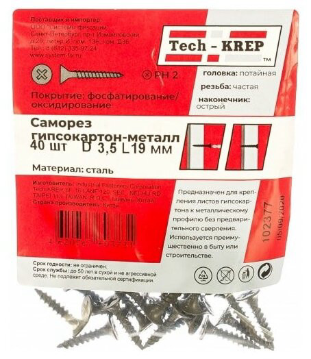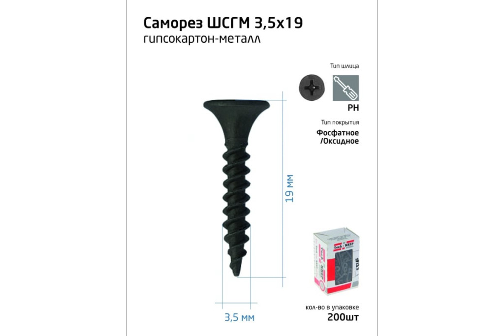 Саморезы гипрок-металл 3,5*19 (200шт) коробка с ок. Tech-Krep