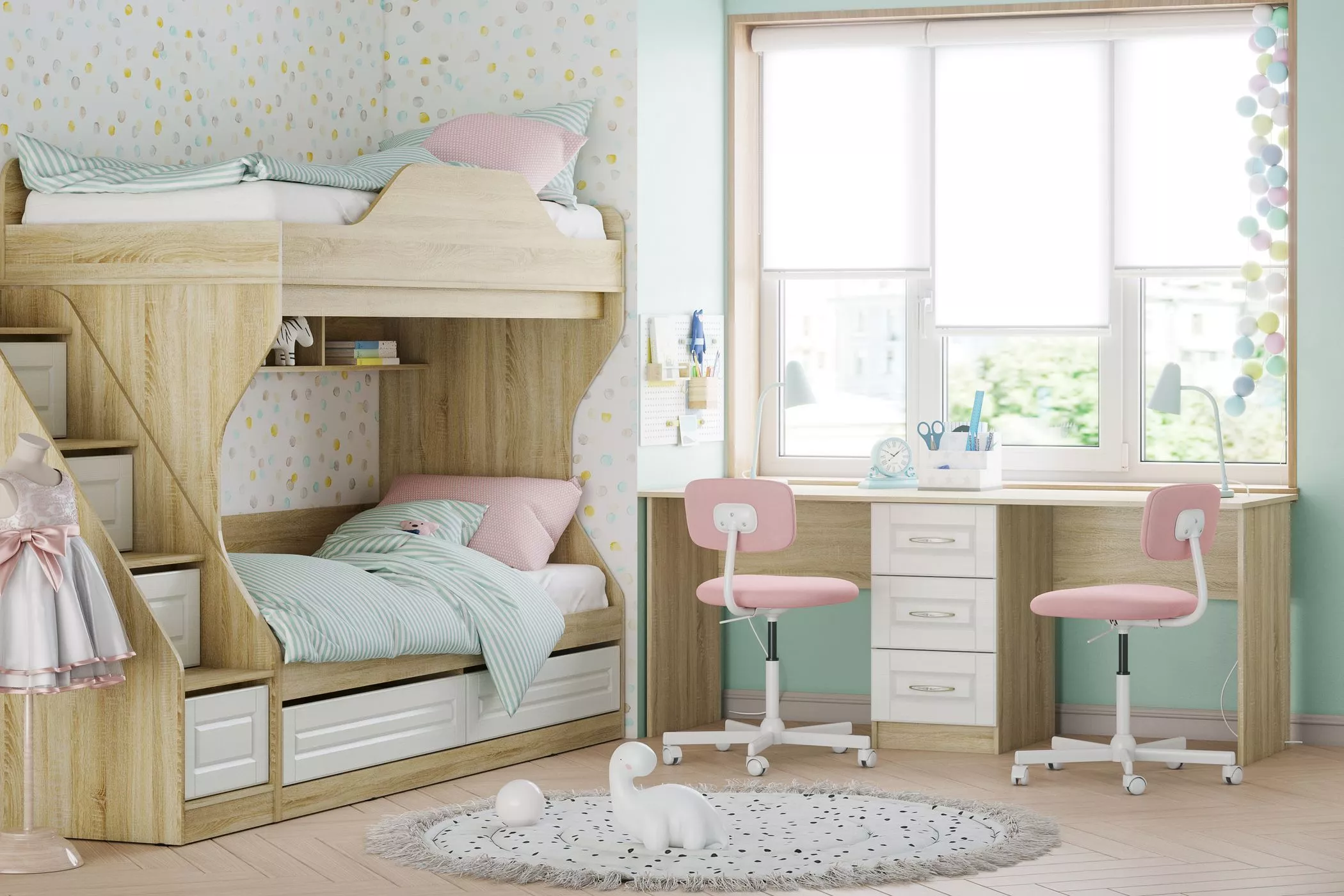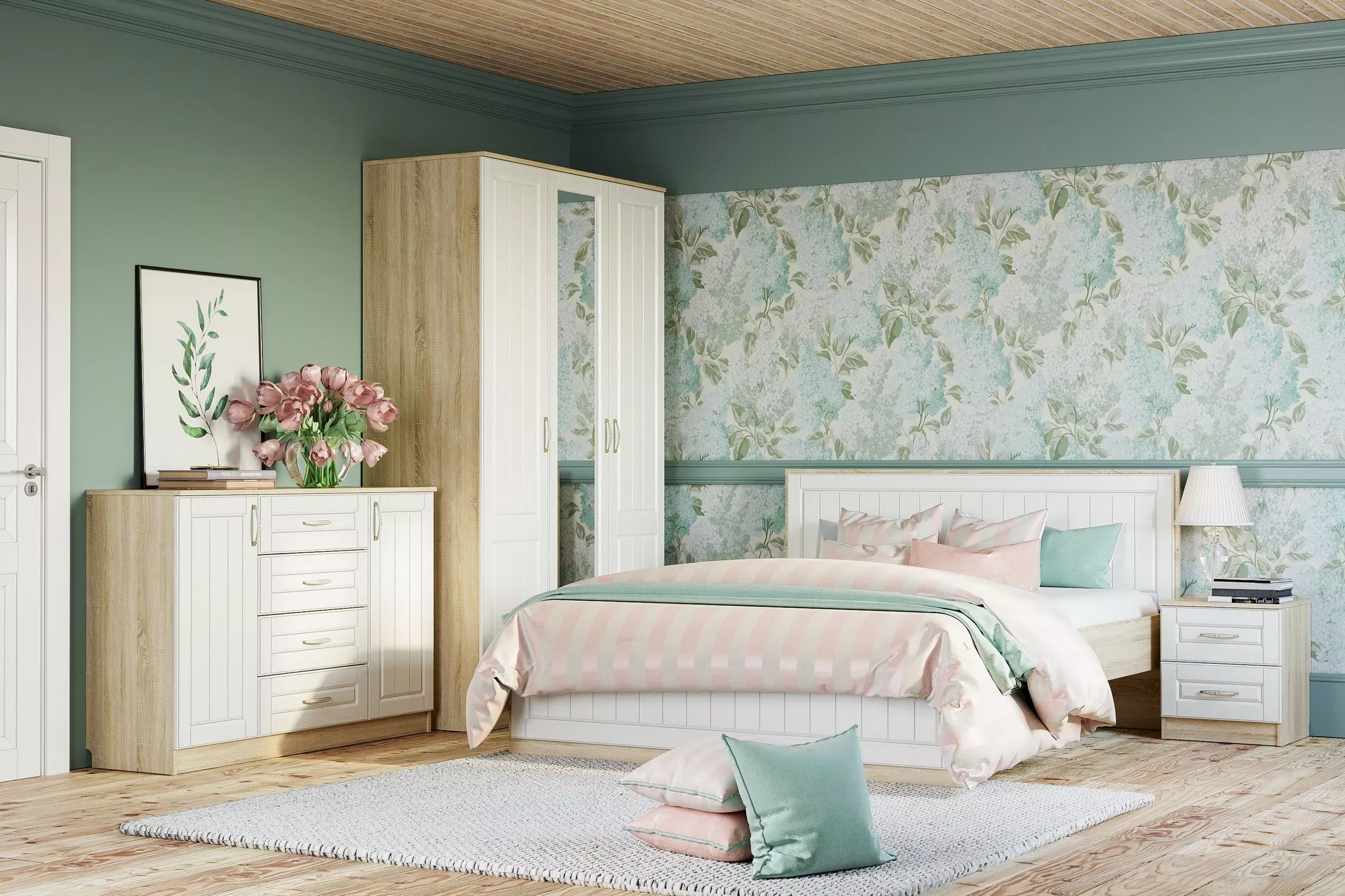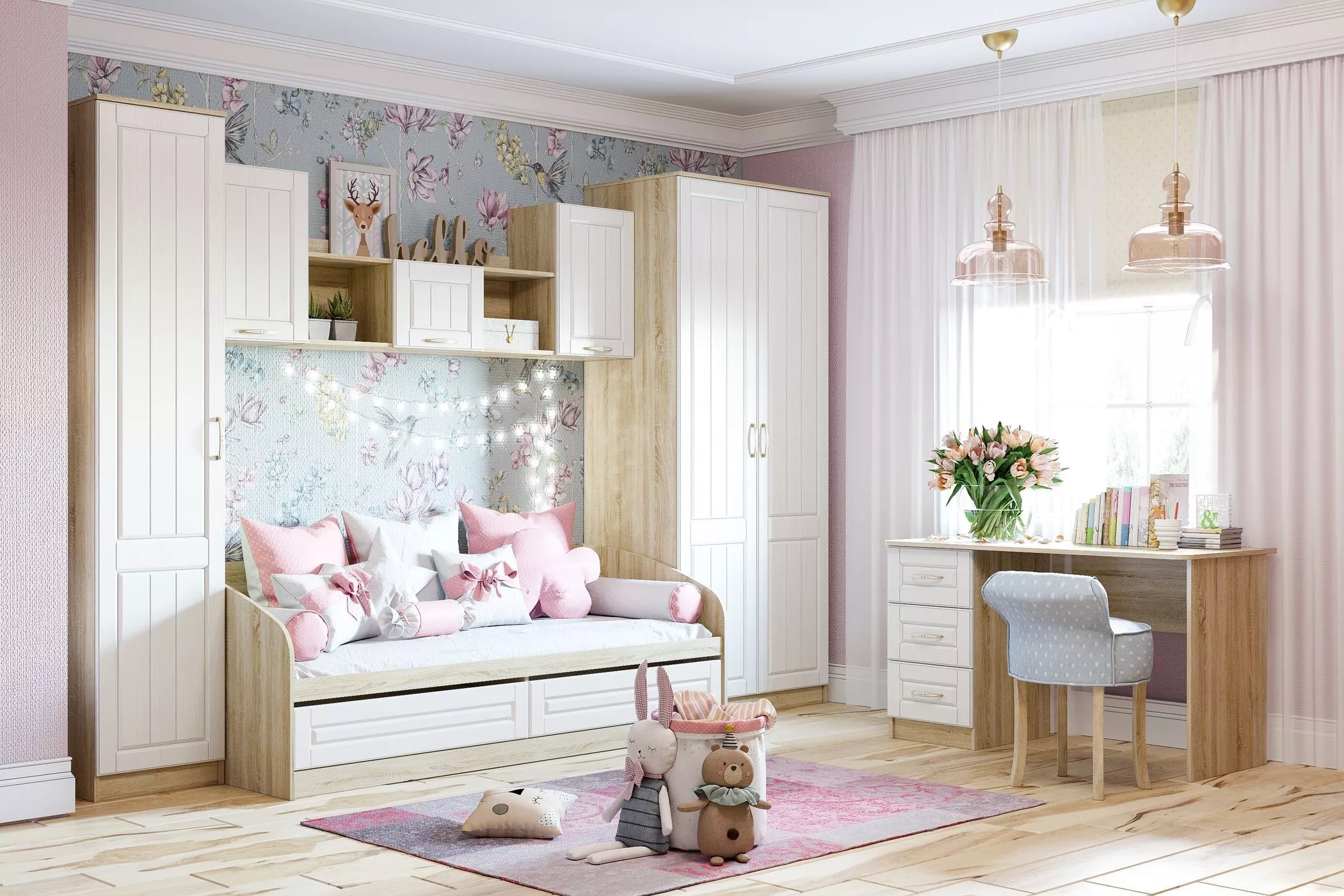 В коллекции есть все необходимое для создания функционального пространства. Благодаря своей особой конструкции кровать с ортопедическим основанием не только обеспечивает здоровый сон, но и облегчает процесс уборки в комнате. Сочетание шкафа и комода позволяет рассортировать одежду и постельные принадлежности, а все необходимые вещи будут всегда под рукой в ящиках прикроватной тумбы.