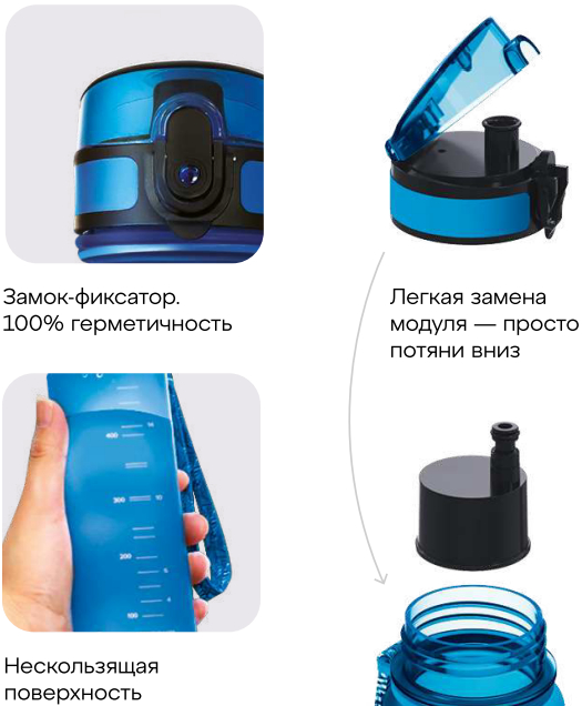 Матовое бархатистое покрытие бутылки приятно на ощупь, широкий ремешок дополнительно фиксирует бутылку во время использования, защитный колпачок не даст воде пролиться в сумке. Объем 0,5 л оптимален для утоления жажды на ходу, новую порцию воды для фильтрации можно добавить, как только это будет необходимо. Удобно для поездок и перелетов.